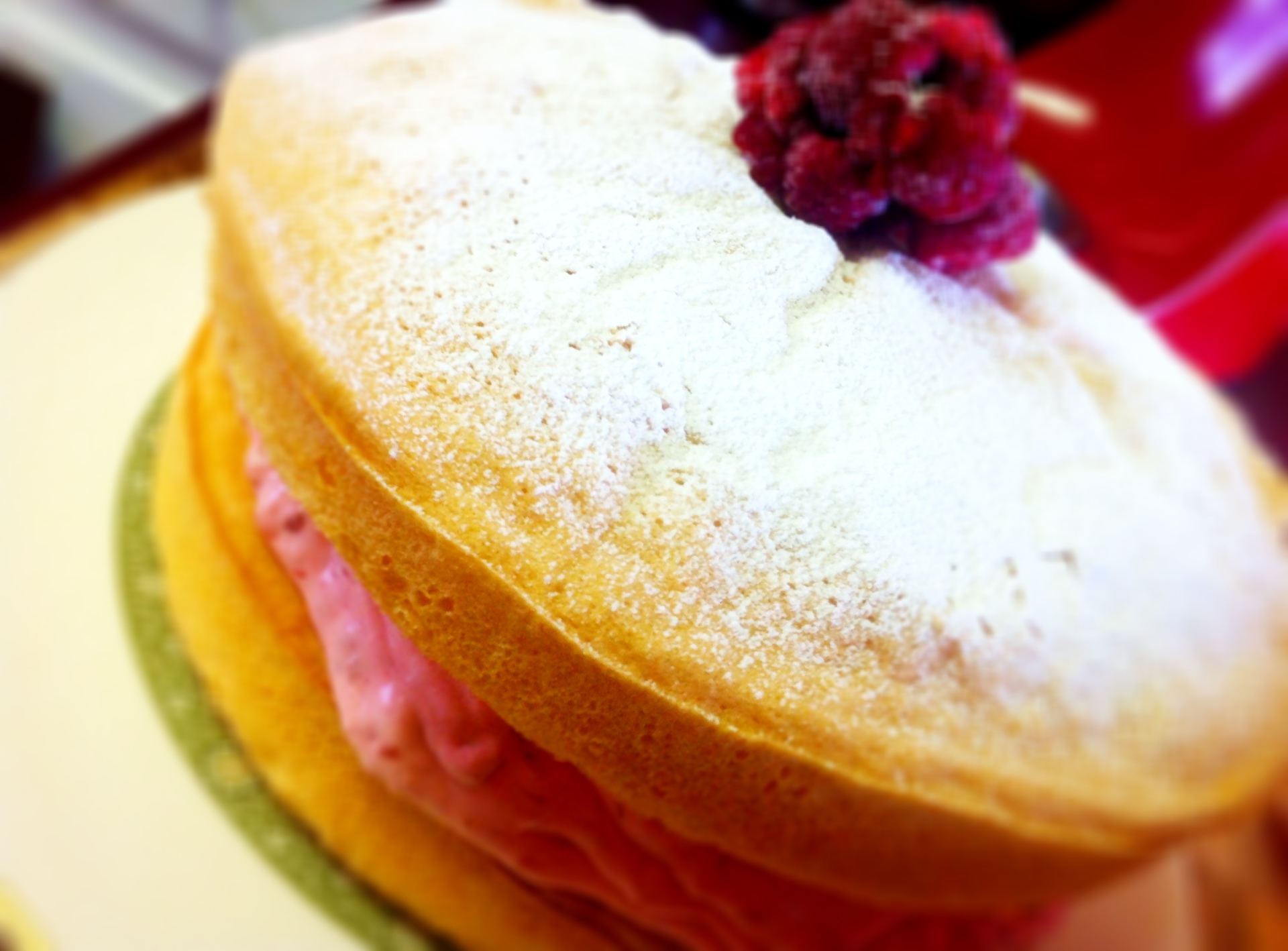 Summary: I have never attempted a proper sponge cake before – that’s a big admission but as Nigella says “Feel the fear and cook it anyway”. This recipe was taken from an old CWA cookbook and I was thrilled with it’s simplicity and was also somewhat surprised when it worked perfectly. Rather than the usual raspberry jam and cream, I thought real raspberries might be nice. I used frozen but mostly defrosted berries but by all means use fresh if you have them.