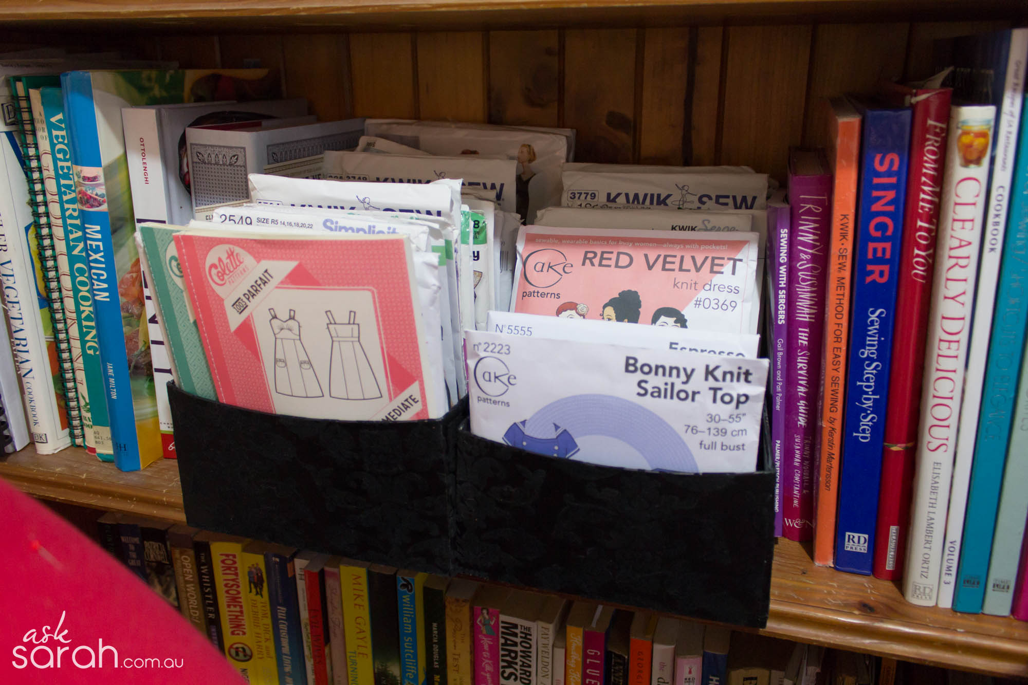 I am a pattern tracer, rather than a cutter. I trace mine on to Vilene/McCalls pattern trace. Once I’ve traced a commercial pattern, I put the whole pattern envelope & the tracing into an A4 snap lock bag. I do the same with PDF patterns, making sure I put the printed instructions in. With self drafted patterns, I draft on ikea roll paper, once I’ve made it & know it works, I trace and snap lock it too. I store these in file hangers in my file cabinet. I have a file for each type of garment. I note where they’re stored in Pattern File. Patterns that haven’t been traced or made are in gift boxes in my bookcase for easy flipping through. Doing these things makes it much easier to plan my sewing (more on that later) and also keeps me from going nuts looking for things!