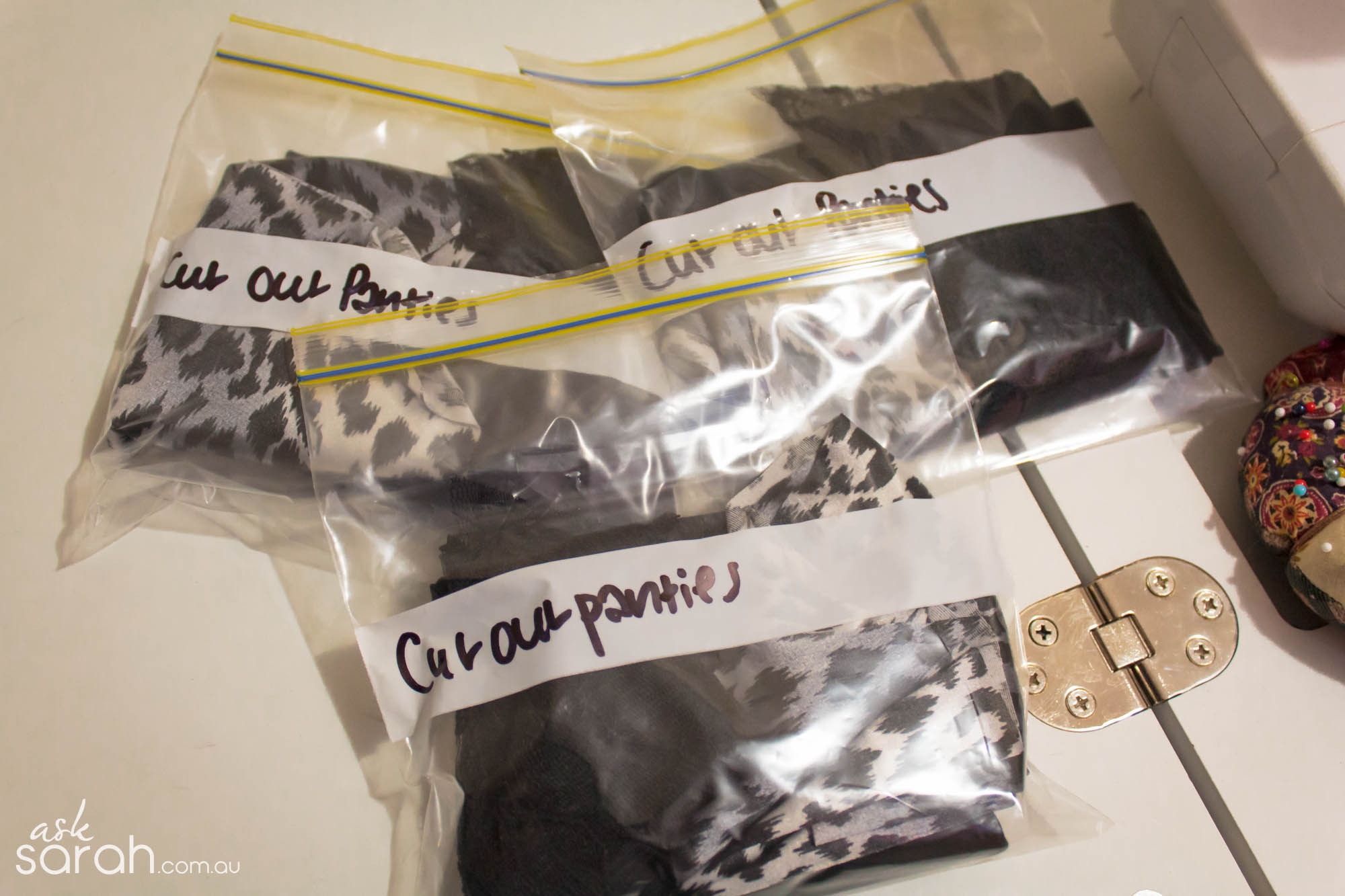 I’m not into cutting out. There, I’ve said it. I find it a complete pain in the butt. Not only do I not enjoy it, it means ousting Mr Ask from the lounge so I can put the table up. It also makes mess and fluff. So, if I’ve got the time and inclination I’ll get something cut out for later sewing. Sometimes I know I want to make several of something, like my fave skirt or knickers, so I’ll cut multiples at once. I recently cut 3 pairs of knickers, put each pair in a snap lock with the notions, trims etc I’ll need for later. Which brings me to the next tip…